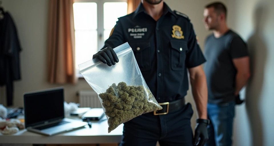 W mieszkaniu policjanci wstępnie zidentyfikowali zapach marihuany i przeprowadzili przeszukanie. Znaleziono środki odurzające o łącznej wadze 76 gramów, wstępnie rozpoznane jako marihuana i mefedron. Podejrzanemu przedstawiono zarzut posiadania znacznej ilości środków odurzających, za co grozi kara do 10 lat pozbawienia wolności.
