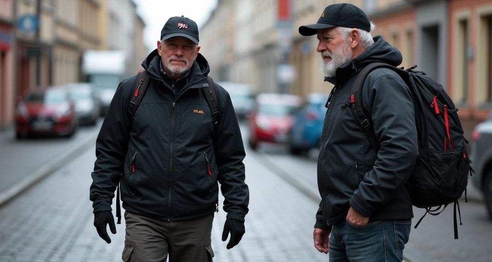 - Pierwszy: czarna kurtka z kapturem, czarne spodnie dresowe z jasnymi wstawkami wokół kieszeni, ciemne buty trekkingowe do kostki, czarna czapka z niewielkim jasnym napisem, czarny plecak z czerwonymi wstawkami.